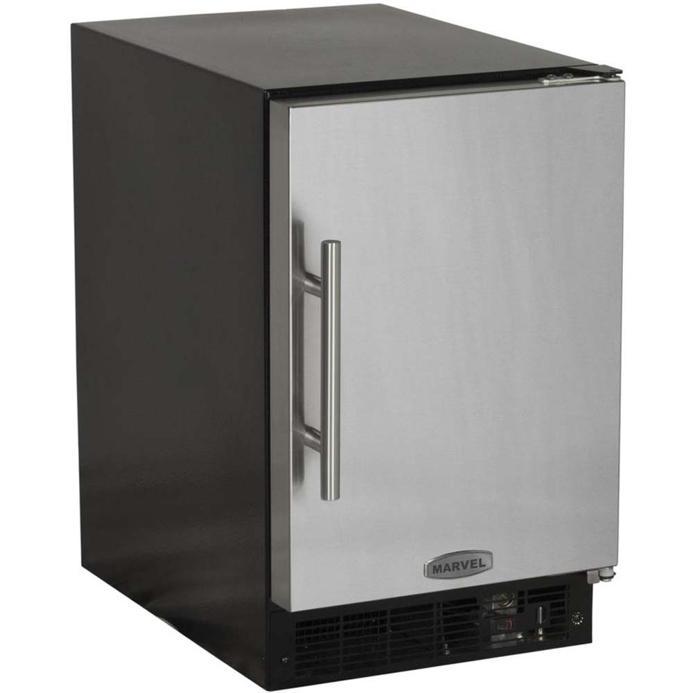 This ice machine can produce up to 7 lbs of crescent ice in 24 hours and store up to 15 lbs of crescent ice. This crescent ice machine comes with a removable ice bucket, a 16-oz ice machine sanitizer, and a 4-oz ice machine cleaner. The Marvel ice machine comes equipped with an insulated thermal-efficient cabinet and a Close Door Assist System that gently and automatically closes the cabinet door. This unit's interior is an arctic white that can be easily cleaned.