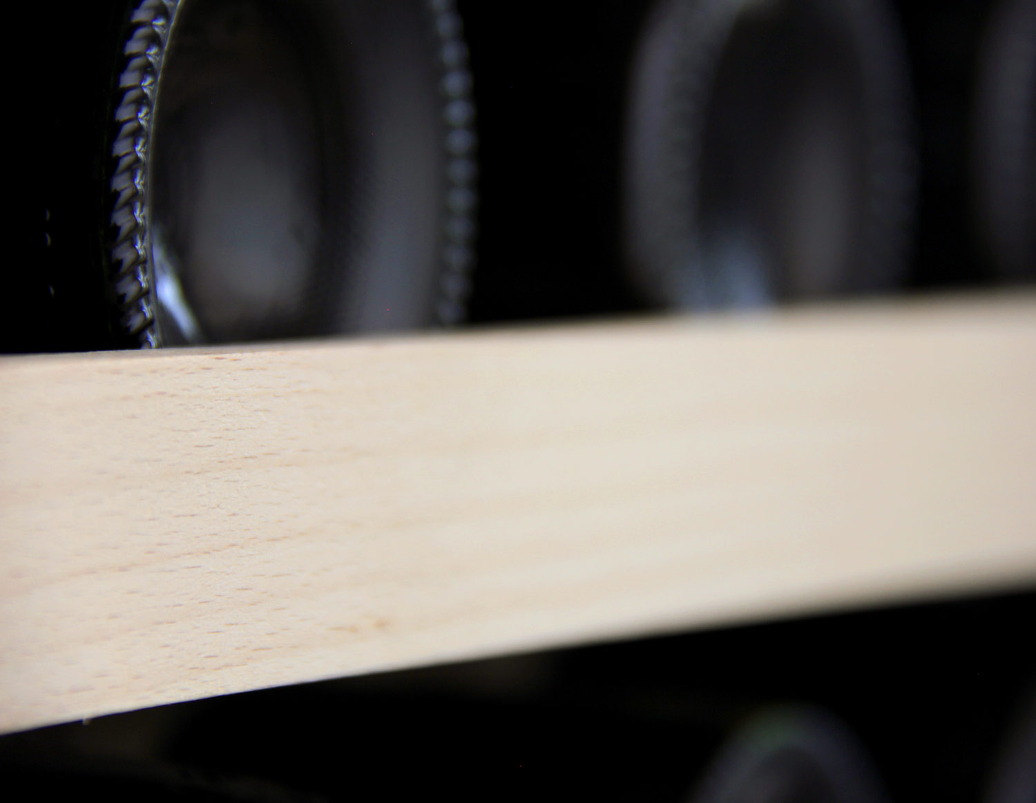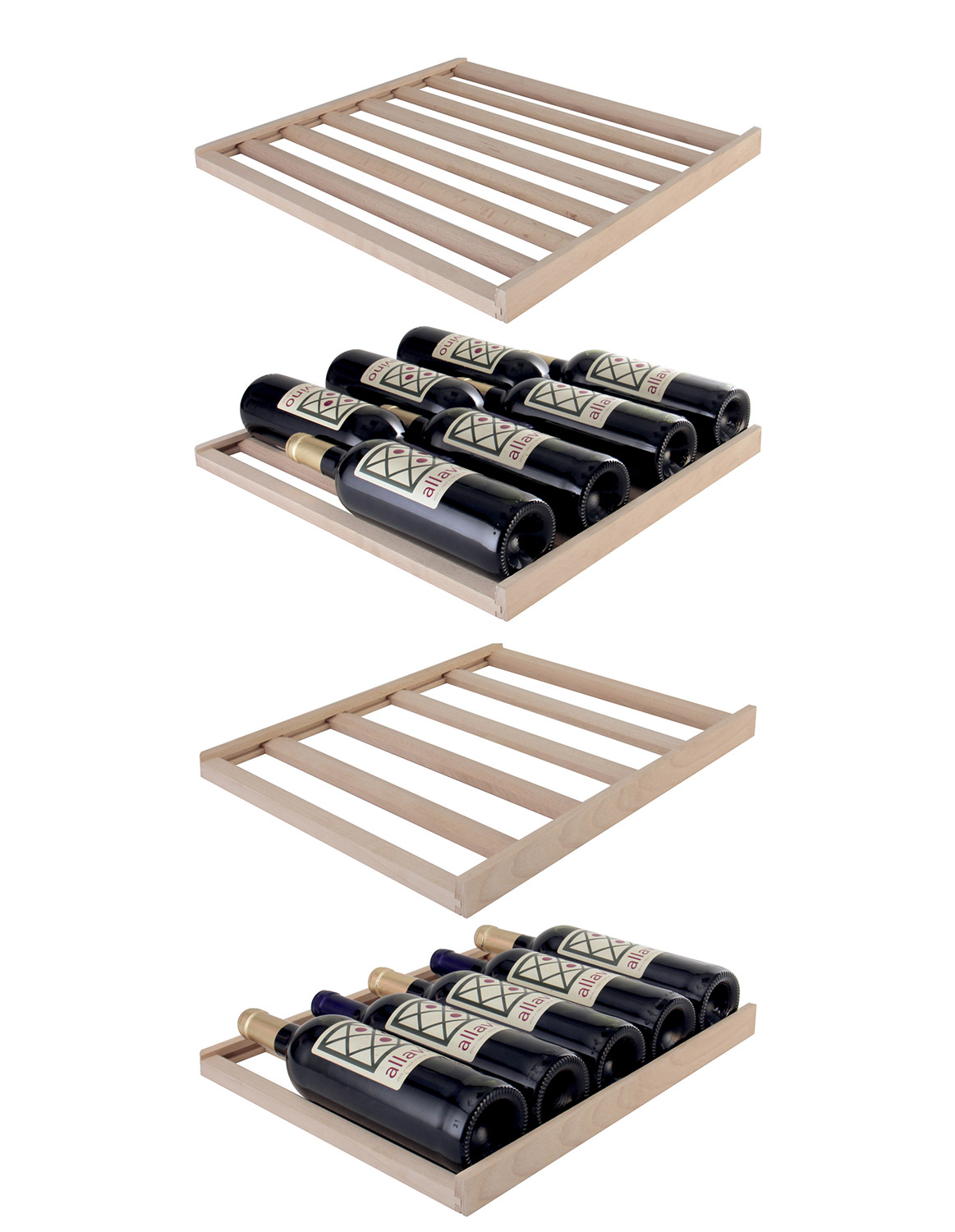 Sturdy wood shelves feature slats that gently cradle your bottles, minimizing agitation to your wine