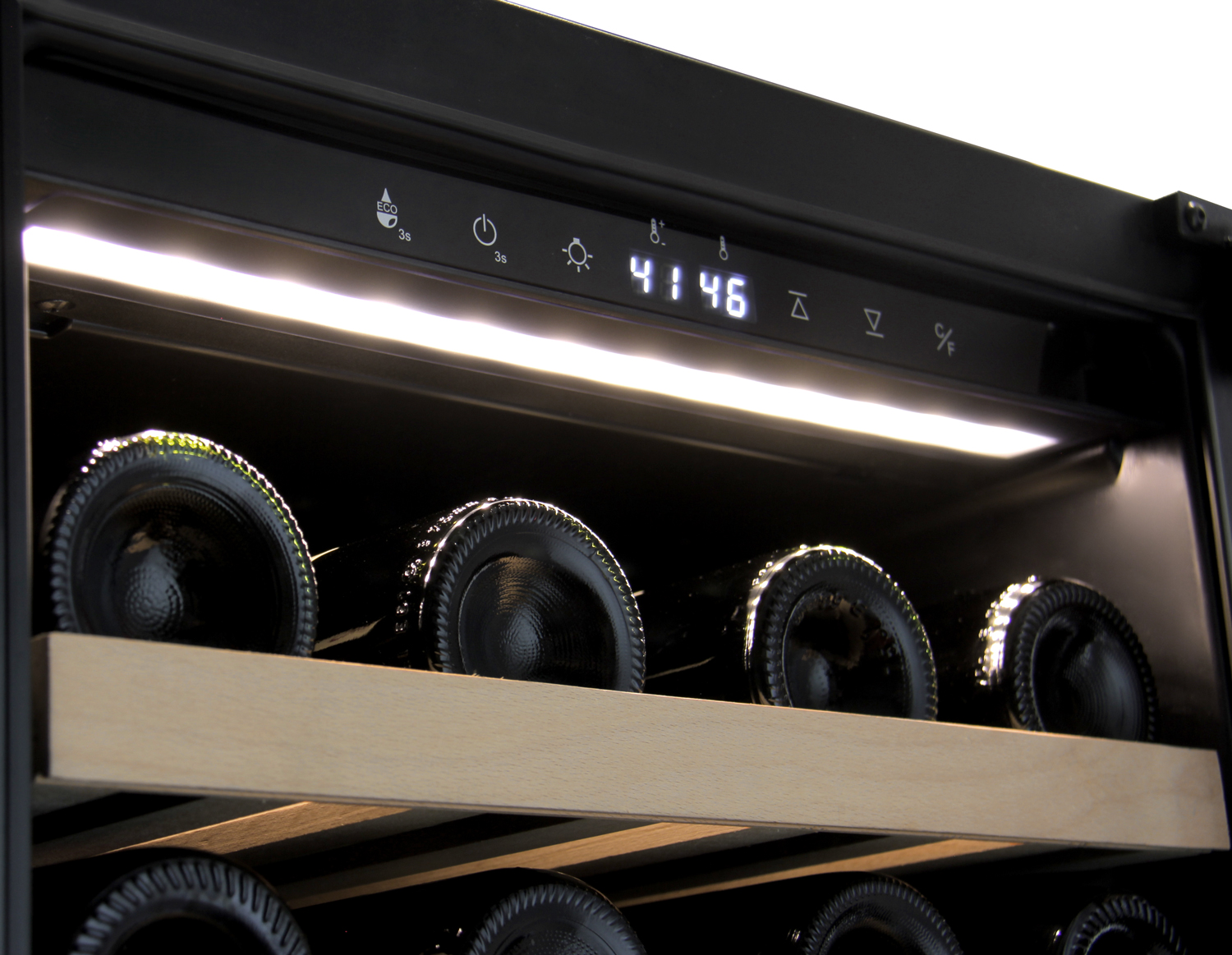 A clear digital display with easy-to-use push button controls makes setting and monitoring the temperature a snap! Cool white LED lighting beautifully elegantly illuminates your bottles while remaining cooler than standard bulbs, and can be turned on or off with the push of a button.