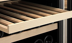 This wine cellar utilizes durable and elegant wood wine shelving to safely store your bottles. The shelves feature slats that cradle your bottles, helping to minimize movement and vibration that could disturb your wine's sediment. Each shelf can be pulled out for easy access to every bottle in your collection.