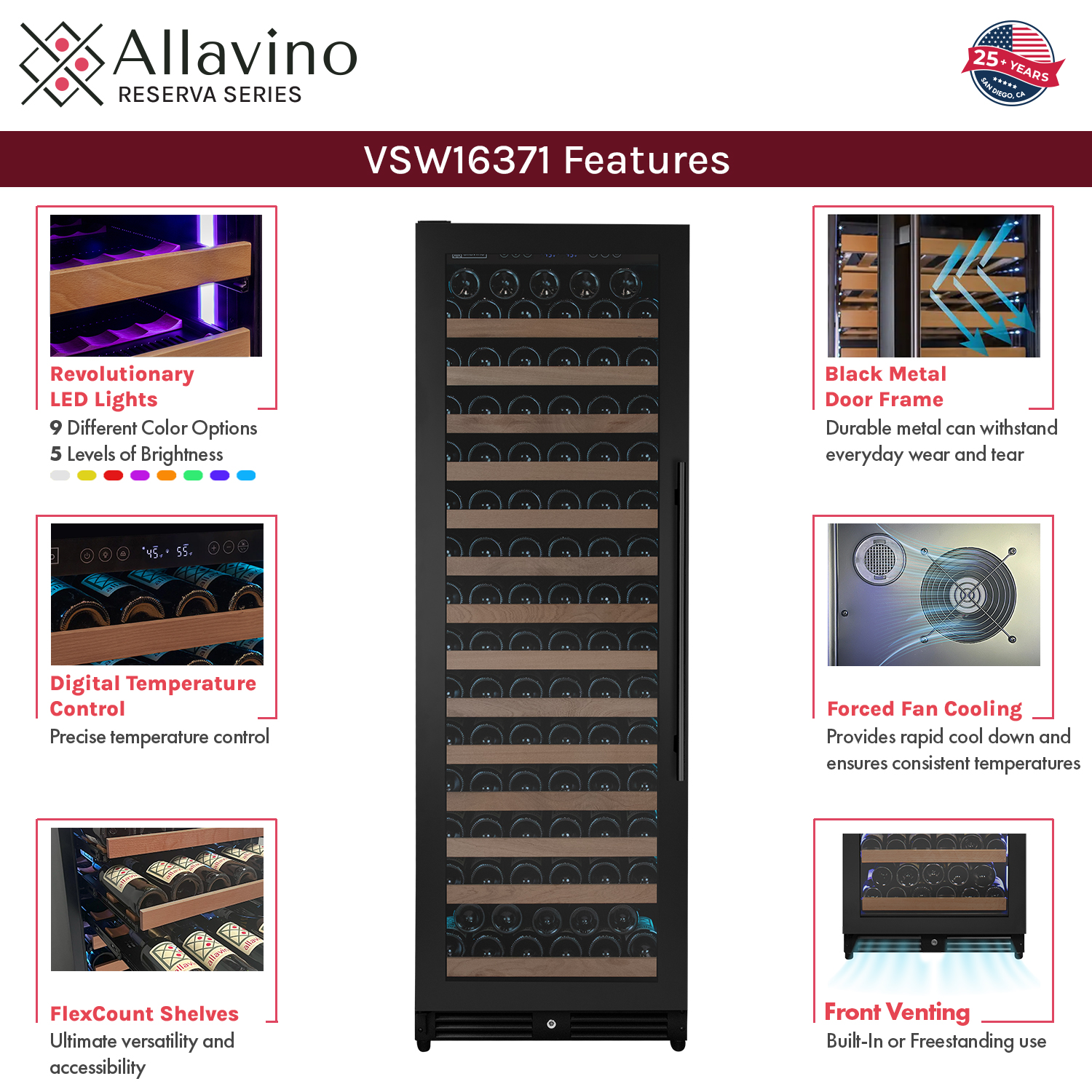 - Allavino Reserva Series Wine Refrigerator stylishly stores your wine, thanks to the seamless black metal door and customizable LED lighting