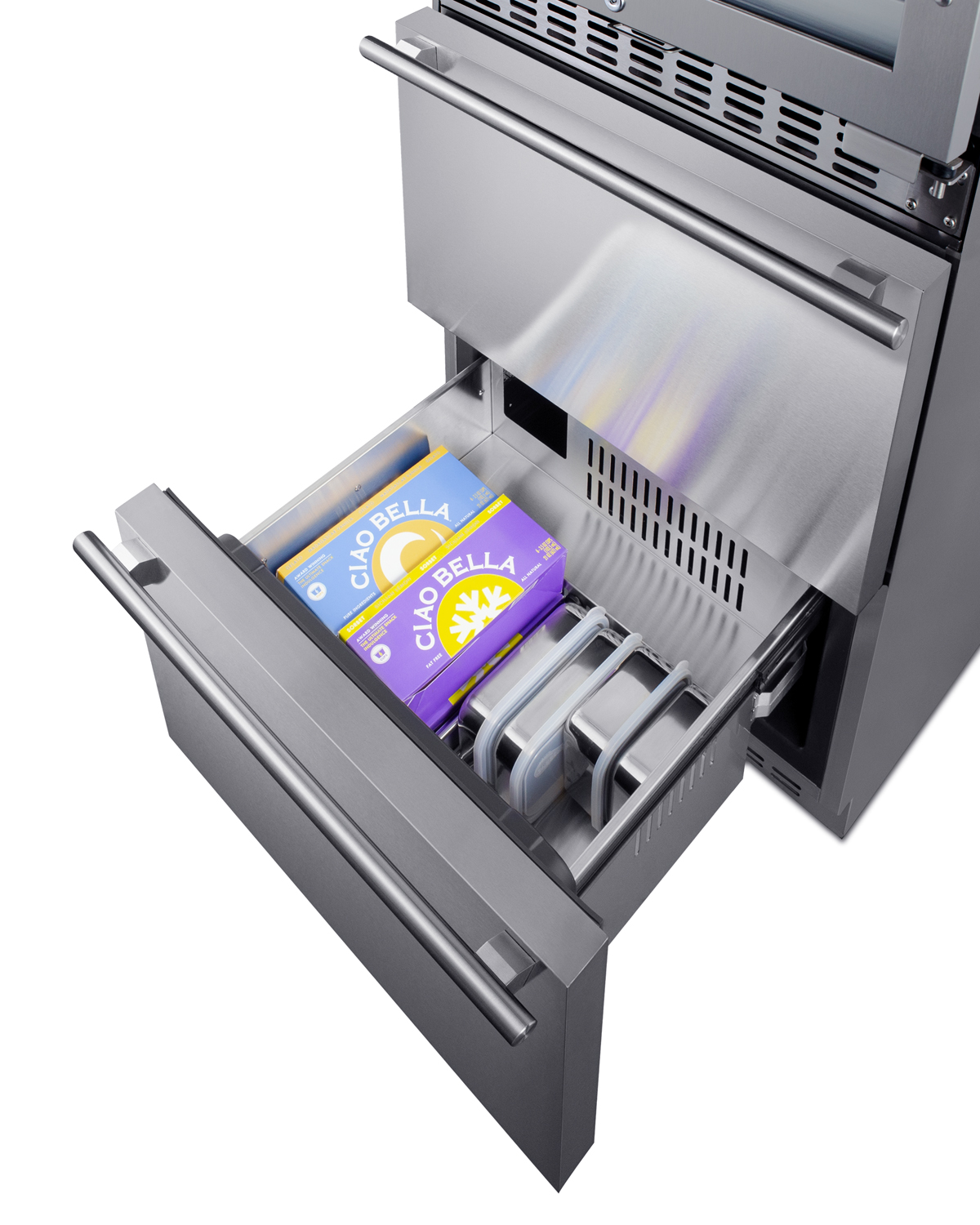 Two stainless steel drawers (freezer) Slide-out drawers offer 3.4 cu.ft. of interior storage