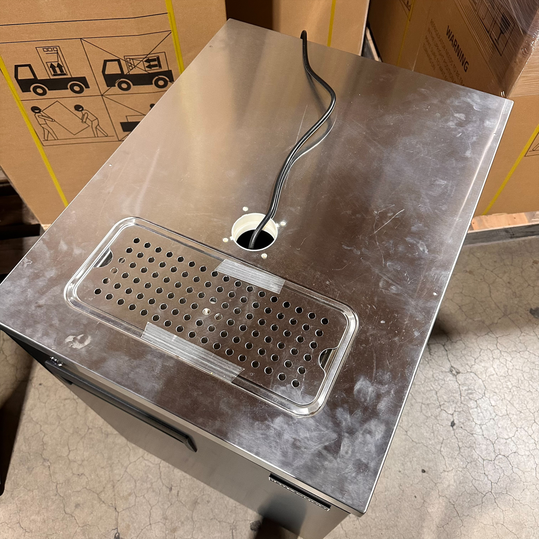 This unit was inspected to ensure it includes all standard parts and manual. It's in good physical condition with exception of a small dent on the right side and scratches on the top and grill. (see final photos). Damage does not affect the performance of the unit. Kegerator has been tested to ensure it is in good working condition with a temperature that was verified down to 34°F on the lowest setting.