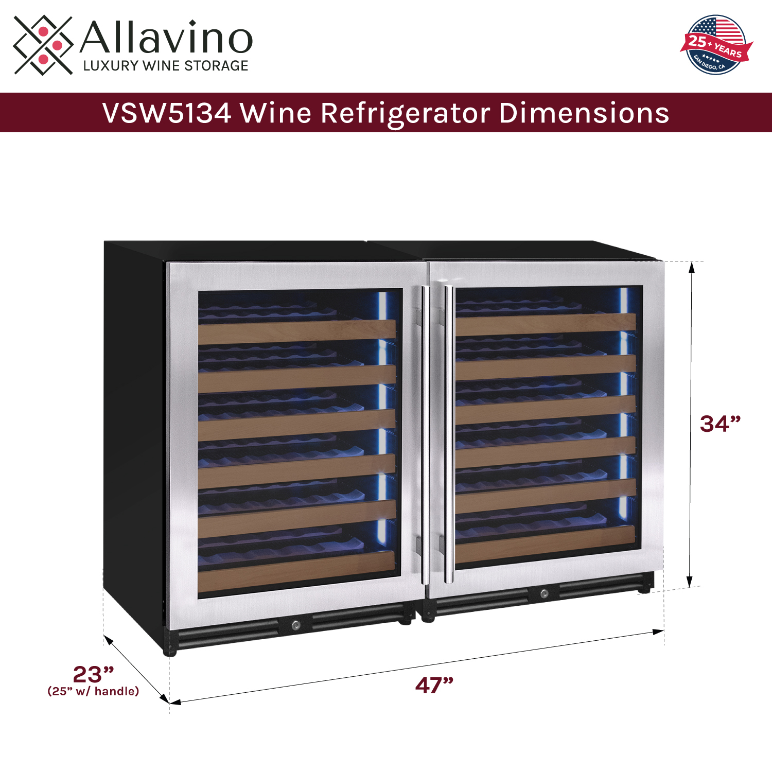Dimensions: 34" H x 47" W x 23" D (25" w/ handle)