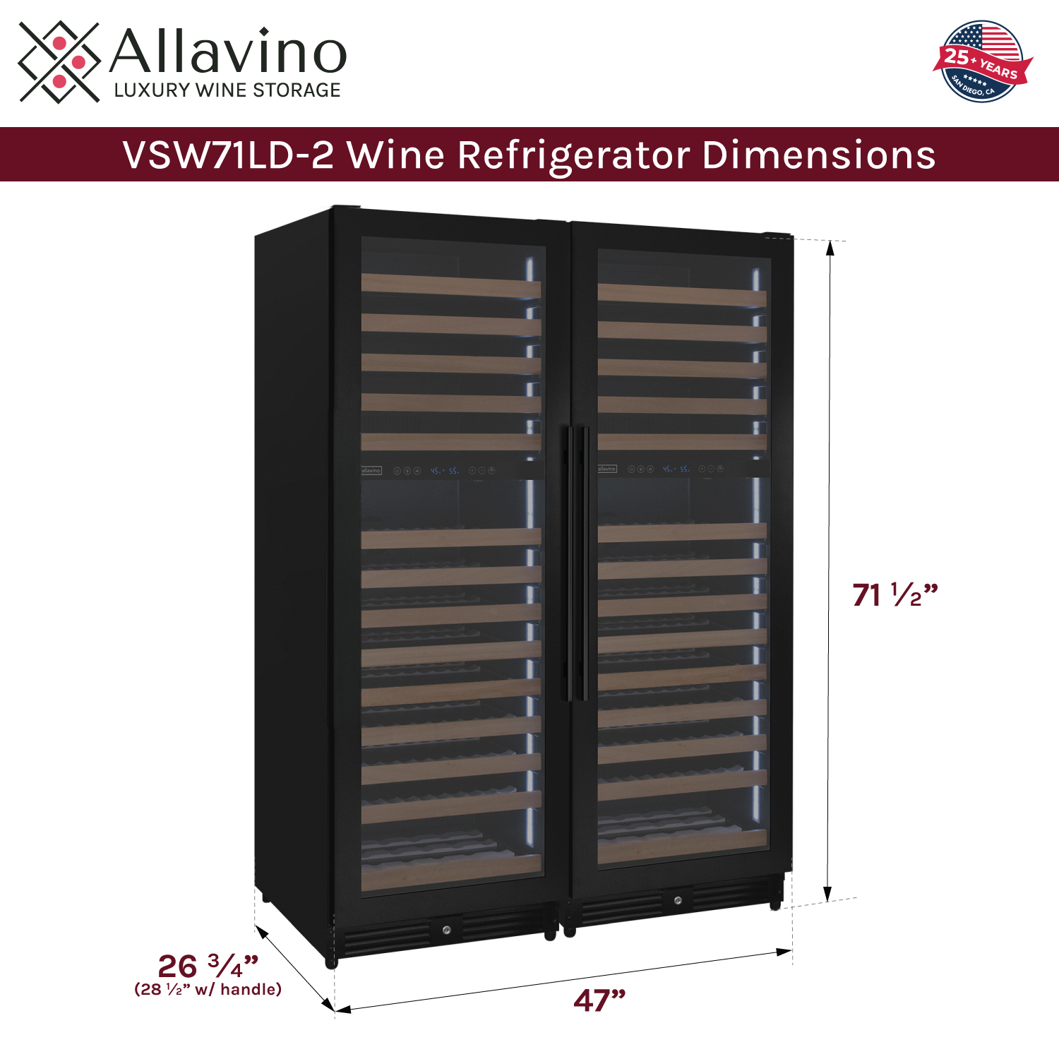 Dimensions: 71.5" H x 47" W x 26.75" D (28.5" w/handle)