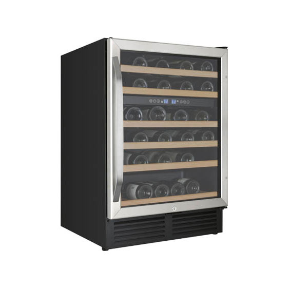 The Avanti WCR496DS 24" Wide Built-In Dual Zone 49 Bottle Wine Chiller is loaded with features and functionality. Boasting two separate temperature zones with a range of 40°F-55°F in the upper and 55°F-65°F in the lower, you can store a wide variety of beverages for enjoyment later. This unit features a double pane tempered reversible glass door, with vinyl coated roll-out shelves featuring wooden fronts, and a select shelf designed to accommodate larger diameter Burgundy bottles. The security lock and key will keep your collection safe, and you can rest assured the product is ADA compliant.