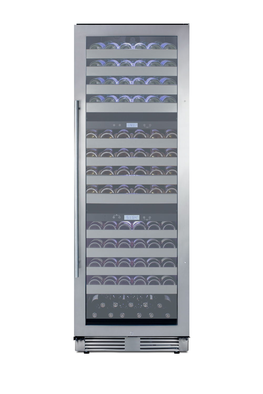 Inside, the SWCP1988T includes 12 full-extension black wire shelves, four in each zone, positioned on ball bearing glides for smooth loading. Stainless steel fronts offer a modern touch. Optimal storage capacity accommodates up to 149 standard 750ml Bordeaux bottles (note: your capacity may vary depending on the bottle style). For wider Burgundy style bottles (typically used for Pinot Noir and Chardonnay), the SWCP1988T can hold up to 102 bottles. 13 white LED lights are positioned on the sides and top of the unit to attractively illuminate your collection for a stylish display. A charcoal filtration system keeps the interior odor-free. Additional features include an open door alarm and high/low temperature alarm that sound if the unit temperature goes out of range.