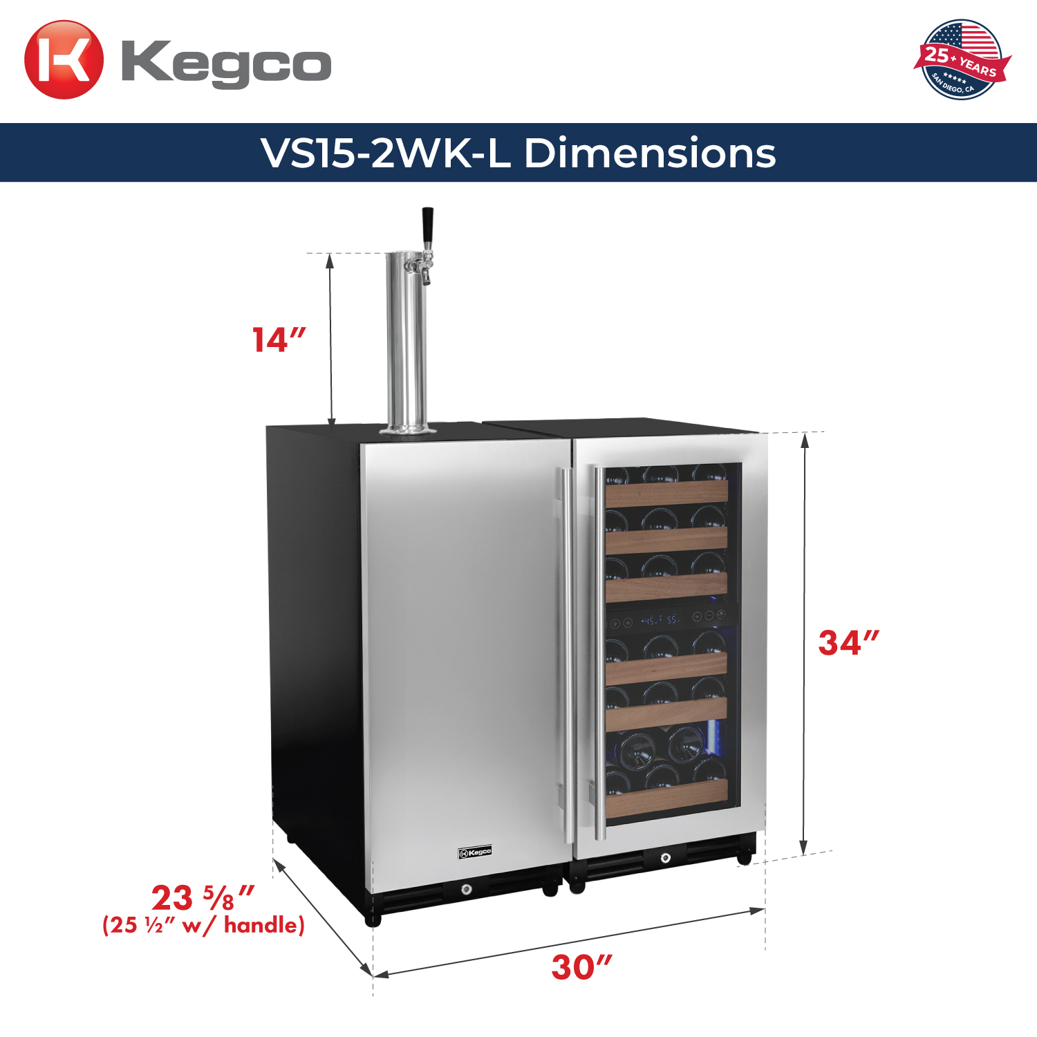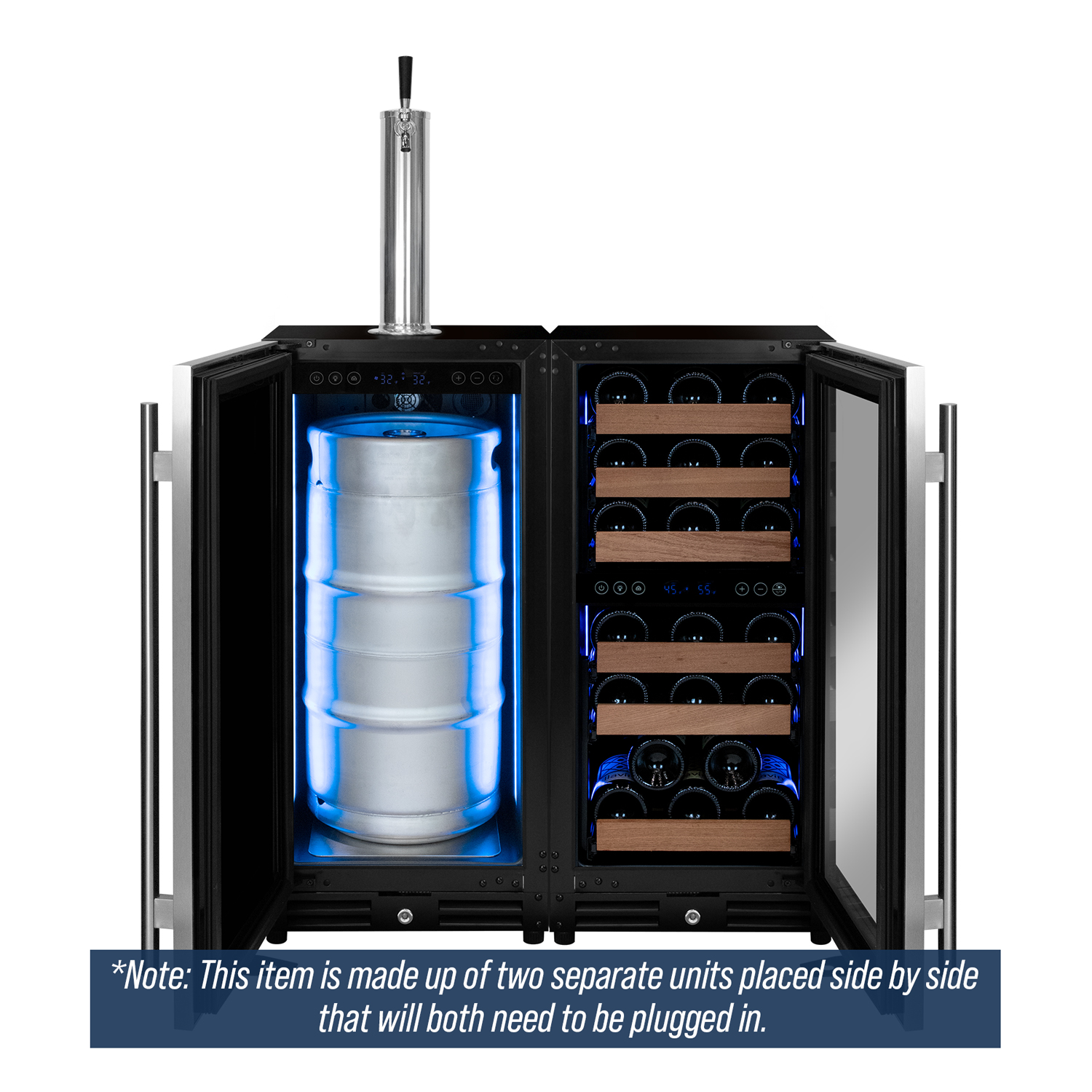 The VS15-2WK-L Built-In Side-by-Side Wine Cooler and Single Faucet Keg Dispenser is the ultimate beverage center to upgrade your home bar or kitchen. This sleek and sophisticated kegerator and wine refrigerator combination lets you have the best of both worlds. Cold beer on tap and perfectly chilled wine is within arms reach with this beverage center that can hold a 7.75 gallon draft beer keg and up to 30 bottles of wine. This unit is perfect for daily use and entertaining, providing you with a variety of beverage options. The unit is designed with a French door swing to easily access both the keg and wine bottles simultaneously. Digital temperature display for both sides allows you to easily maintain and control the temperature of your beverages. Manufactured by the industry leaders in the beverage industry, Kegco and Allavino, these units include only premium parts with all stainless steel contact and all parts are serviceable. *PLEASE NOTE THIS IS TWO SEPARATE UNITS