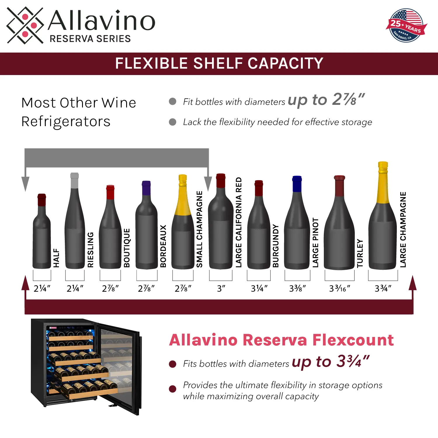 Our trademarked design provides the ultimate flexibility in storage options while maximizing overall capacity. The FlexCount wood slats allow storage for bottles with varying diameters without the need to remove any racks