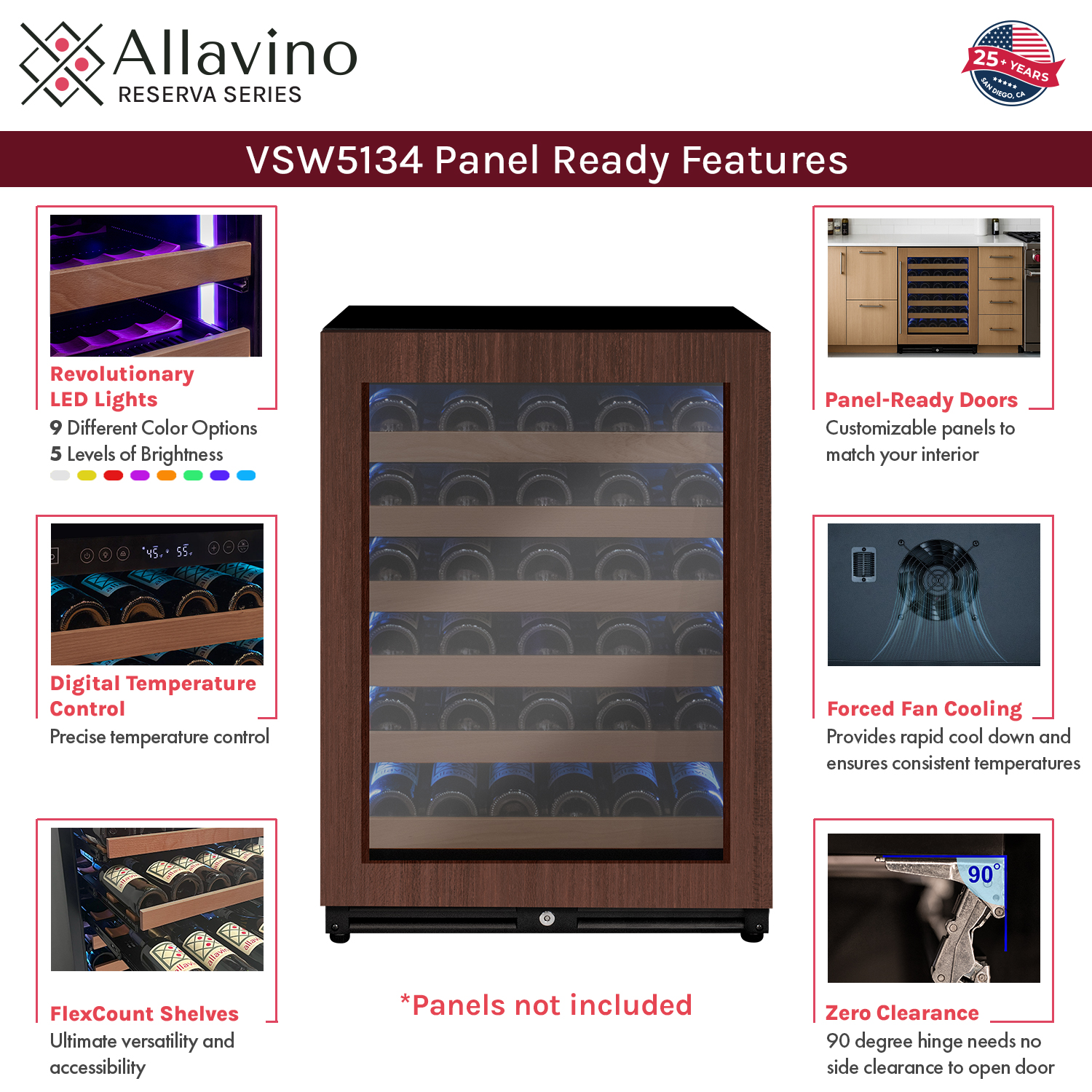 Revolutionary Reserva LED lights give you 8 different color options + 1 full cycle option that rotates through all colors. Unlike incandescent lighting, LED lighting does not give off heat that can damage your wine. The LED light strips are flush with the wall interior allowing more storage space for your collection.