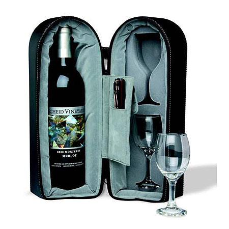This leatherette, zippered soft case holds a bottle of wine in a well padded compartment (bottle not included) and two 5 oz. rim-full glasses (included) in velvet foam forms. The sewn-in pouch can hold a corkscrew in the open pocket and a stopper in the Velcro closed pouch on the opposite side. (You may customize the case with imprinted or unimprinted items from the Franmara line). Carrying strap above. Four metal studs at the base. Stands 13-1/2" tall, 7/8" wide, 4-3/8" deep.