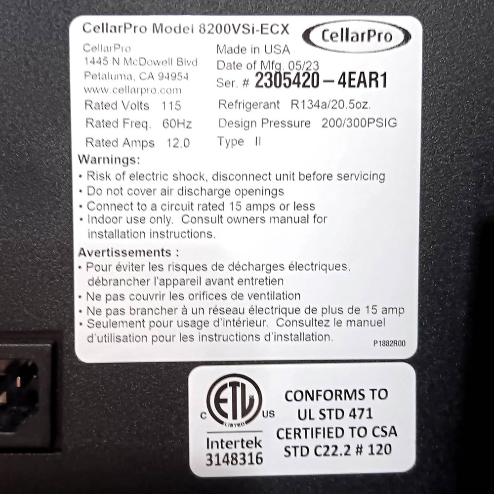 CellarPro 8200VSi-ECX Cooling Unit (P/N 14786). NOW WITH ENERGY-EFFICIENT EC FANS! CellarPro engineered the 8200VSi-ECX cooling unit to provide maximum cooling power and adjustable humidity control for cellars up to 2,200 cubic feet. Designed for internal installations, 8200VSi-ECX units are built with high-output Tecumseh rotary compressors and oversized coils for maximum performance in high-temperature environments up to 110F. These units also feature variable-speed fans with a low setting for quieter operation when conditions permit.