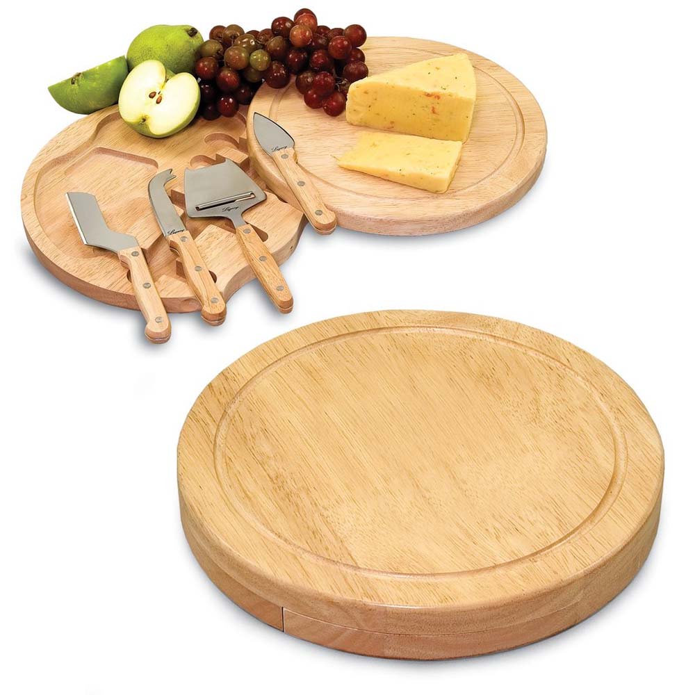 - This cheese board set utilizes its innovative circular shape with swivel capabilities to conveniently store four cheese tools inside the cutting board