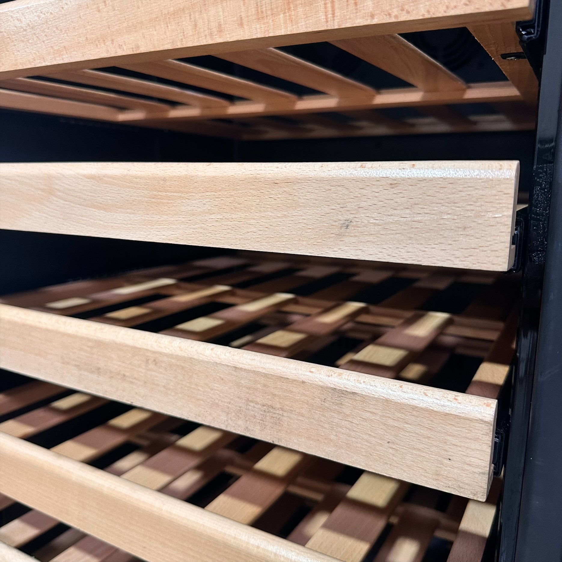 90% effortless shelf extension on smooth, heavy duty ball-bearing tracks allow easy access to your back row collection minimizing agitation to your wine. Thin metal racks with slotted venting allow thorough airflow while simultaneously preventing sagging.